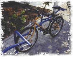 oberen Rahmendreieckk sichert. Grundsätzlich können Fahrräder an den stabilen Anlehnbügeln auch mit jedem handelsüblichen Bügel- oder Seilschloß angeschlossen werden. Ausführung: Fahrradparker Alpha sind als Einzelständer, Doppelständer oder Reigenanlagen erhältlich
