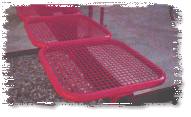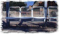 Stahlgitter-Sitzen Mit Stahlrohr - Unterkonstruktion zum Anschluß an die Stützen der Tragkonstruktion (in Fundamentköcher integriert). Einzelsitze ca. 415x350 mm aus stabilem Drahtgitter - ohne Rückenlehne - feuerverzinkt und zusätzlich pulverbeschichtet in Farben der Tragkonstruktion. |